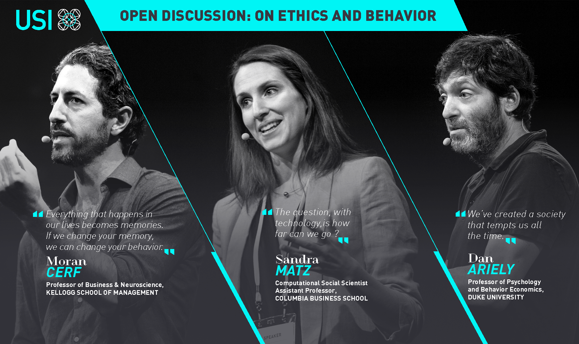 Première à l’USI, l’édition 2018 propose une Open discussion entre trois experts en psychologie et sciences sociales, Dan Ariely, Moran Cerf et Sandra Matz. Le sujet abordé, à la fois épineux et passionnant, se positionne à la limite de la science et de la philosophie : peut-on modifier le comportement humain de manière éthique ?