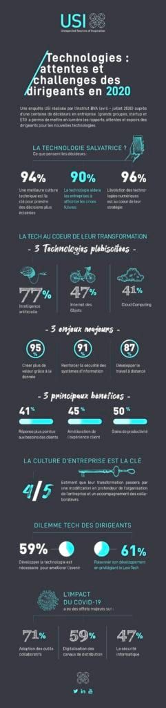 À travers une enquête réalisée en collaboration avec BVA (avril - juillet 2020) auprès d’une centaine de décideurs en entreprise, nous avons cherché à comprendre quels sont les rapports, attentes et espoirs des dirigeants d’entreprises de toutes tailles (grands groupes, start-up et ETI) pour les nouvelles technologies : leurs influences, les éventuels risques qu’elles représentent et les opportunités qu’elles offrent.